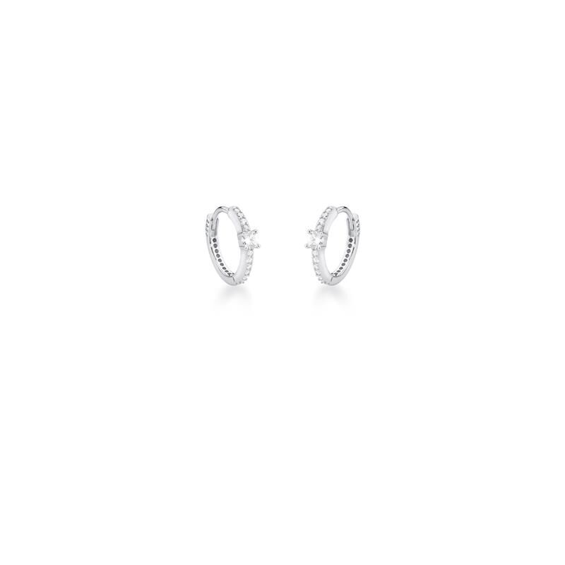 Este aro con cristal blanco central y circonitas engastadas es la combinación perfecta entre lujo discreto y diseño contemporáneo. Fabricado en plata 925 con baño de rodio, su cierre de clic proporciona seguridad y comodidad para el uso diario. Su estilo versátil lo convierte en un imprescindible para elevar cualquier look, desde el más casual hasta el más sofisticado.